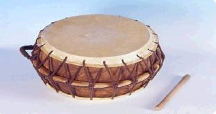 鼓框?yàn)槟举|(zhì),兩面蒙皮,用繩索固定在木框兩邊。鼓鏈木質(zhì),通常在表演中負(fù)責(zé)敲擊主要旋律的重拍,也有獨(dú)奏的情況,聲音有力。