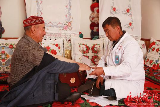 居馬泰·俄白克說,我只有一個想法,就是盡己所能為更多牧民解除病痛。“不管病人有錢沒錢,我都要先把病看好”。從醫(yī)20多年來,他個人為牧區(qū)牧民減免的醫(yī)藥費等已超過10萬元。而居馬泰·俄白克一家五口的生活,全靠他一個人的工資。他因過度勞累,患心臟病,不適合在高原工作。當?shù)匦l(wèi)生局領導準備把他調(diào)至農(nóng)業(yè)村,但是他都婉言謝絕了。妻子動了5次手術(shù),他都因為在牧區(qū)巡診,沒有陪伴過,孩子還小,家里的重擔都讓妻子承擔,說起這些,居馬泰·俄白克心里很愧疚。