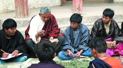 西藏藏醫(yī)學(xué)院的學(xué)生正在研讀記載著藏醫(yī)藥浴法相關(guān)知識(shí)的《四部醫(yī)典》。劉罡 攝