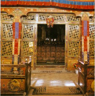 大門由于它的位置所在不應(yīng)該列入室內(nèi)裝飾,但它與室內(nèi)裝飾息息相關(guān),連成一體,故我們把它當(dāng)作室內(nèi)裝飾在這兒加以介紹。門框裝飾包含門框本身、門楣、門楣上的屋檐、門板等。藏族建筑大門裝飾十分講究,從屋檐到門坎都用雕、繪的手段充分加以裝飾。屋檐用兩道方本間隔排列,上蓋青石片和黃土筑成底小頭大的形狀,它不僅有美觀的裝飾效果,而且起到防水作用。屋檐下是門楣,門楣上彩繪各種圖案,門框的木構(gòu)件上雕刻蓮花花瓣和累卷疊函凹凸方格圖案,這種圖案處理形式大部分民居大門大同小異。門板為單開式,板門為了加固起見上、下分層釘鐵條。門板一般涂單一色,不作繪畫處理。除了這些裝飾以外,門相上掛短縐簾,門框左右邊緣墻上涂兩道黑色豎條,每年過年前短縐簾要棄舊換新,黑色豎條與粉刷外墻一道重新涂漆,這是一般民居門框裝飾。寺廟門框裝飾較為復(fù)雜,門楣的間隔方木上加一層雕刻動物頭像的木雕作品排成一行,裝飾門楣這一板塊,門框木構(gòu)件多則六、七層,層層雕刻各種圖案,可見其講究程度。寺廟門板大多是對開式,用鐵條包裝門邊緣,中間分層釘鐵條,涂一層單一的顏色,特殊殿堂如擴法神殿大門門板上要進行繪畫處理,寺廟大門講究厚重、莊嚴(yán)。無論是民居大門還是寺廟大門,其裝飾要求與室內(nèi)梁柱裝飾相協(xié)調(diào),從顏色的運用到雕刻內(nèi)容都要做到這一點,保持內(nèi)外裝飾效果統(tǒng)一。