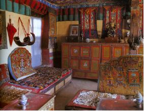 藏族民居室內(nèi)裝飾講究工整、華麗、亮堂,上至天花板下至與地板相接的墻角都采用雕刻、彩繪等藝術(shù)手段加以裝點,尤其是橫梁、柱頭和大門等木結(jié)構(gòu)空間是充分展示裝飾才能的地方,在這里裝飾效果盡其所能。此外寺廟重點佛堂,回廊墻壁上繪制彩畫,這也是一種重要的裝飾手段,而百姓居室內(nèi)的墻壁上用繪制花卉、彩條來取得裝飾效果。
