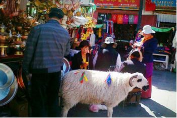 在西藏的許多寺廟及附近,常常會有單獨的、或三三兩兩的脖頸上系著紅布條沒有主人的羊只。主人把它們放生,使它們重歸自然,成為自由的羊,免去了挨宰遭殺之罪。習慣上,這些羊就叫做放生羊。轉經人會自覺自愿給它們吃的東西,它們不會為肚子饑餓而亂躥。也許正因為如此,這些放生羊才會顯得非常乖巧溫順。