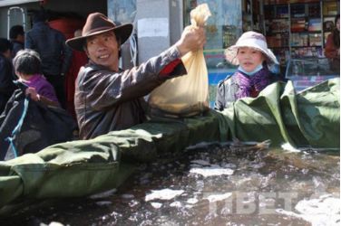 在當地藥王山農貿市場可以看到,很多信眾或帶著器皿或拿著塑料口袋前往水產店買魚放生。甚至有的信眾開著一輛面包車,車廂用塑料包裹,里面裝滿水,載著買來的一整車魚前往拉薩河放生。 “薩嘎達瓦節(jié)期間,魚賣的特別快,藏歷十五的時候我們的魚都被買光了?!彼a市場的李老板說。