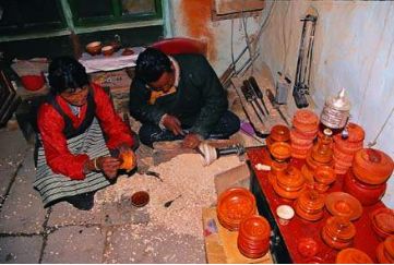 木碗的來(lái)源,一是西藏自己生產(chǎn)的,還有一種是云南迪慶生產(chǎn)的,都是從西藏的市場(chǎng)上交換或購(gòu)買的。西藏林芝地區(qū)的朗縣、察隅,山南地區(qū)的加查、隆子、錯(cuò)那,阿里地區(qū)的噶爾等地均產(chǎn)木碗。其中尤以錯(cuò)那生產(chǎn)的“察牙”木碗和噶爾生產(chǎn)的“堆旭”木碗最負(fù)盛名。以上木碗的原料選擇樹根或樹瘤車制而成,選料之講究,做工之精細(xì),使好木碗的花紋各異,或磷火紋,或豬鬃紋,或貓頭鷹眼紋,這些木碗都很名貴,與普通木碗之間的價(jià)格也很懸殊,一個(gè)上等木碗價(jià)值10頭牦牛,一般人家是不敢問(wèn)津的,但也盡量想方設(shè)法弄個(gè)像樣的,以慰平生。