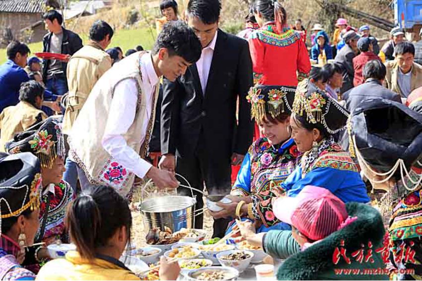穿長(zhǎng)衫,戴著包頭的新郎,把新娘接入正堂屋,將送親的人群迎進(jìn)臨時(shí)搭建的青棚屋休息。青棚,是傈僳族人辦婚事時(shí)砍來(lái)毛櫟樹、香樹枝等臨時(shí)搭起的棚子。既清新又涼爽舒適??梢杂脕?lái)接待賓客,也可以作為跳舞、唱曲子的活動(dòng)場(chǎng)所。晚餐就在青棚里進(jìn)行,宴席一般不用桌子,酒菜擺在青棚下面鋪好青松毛的地上,客人八個(gè)一圈,席地坐在青松毛上,圍著喜筵,既歡樂又開心的喝著美酒、品嘗佳肴。晚飯菜肴十分豐盛,足見主人家的好客和廚師的高超手藝。菜出雙不出單,菜的顏色出紅不出白。一切都象征著成雙成對(duì),吉祥如意。