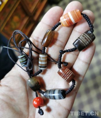 在藏語中,天珠被稱為“瑟”。在普蘭邊貿(mào)市場中,并不是所有的商家都有天珠。但凡是有上好天珠的商家,必有很大的吸引力。在市場中,他們也充滿自信。我在市場中走訪了多家有天珠的商店,并簡要總結(jié)了多數(shù)商家對天珠的認(rèn)定標(biāo)準(zhǔn)。在尼泊爾商家的眼中,天珠的質(zhì)量要看幾個方面。一是“石頭”的質(zhì)量,上好的“石質(zhì)”是好天珠的必要條件。他們在檢驗時,多用門牙上下撞擊天珠的不同位置,便可以分辨出天珠料子的好壞。在那里,我也遇到了幾位買天珠的僧人,其辨別過程中也使用了這樣的方法。二是包漿程度,一顆好天珠就要有相應(yīng)的歲月的痕跡,而包漿就是歲月長短的最重要的代表。當(dāng)然,這也并非絕對,因為包漿的形成主要依靠人為的把玩,那些沒有相應(yīng)包漿但達(dá)到上千年的天珠在他們眼中依然很快便會被識別出。在尼泊爾的茶館中,一位當(dāng)?shù)氐牟刈迦罕娤蛭医榻B了一顆天珠,據(jù)說有人曾用成都的一套房子來換,但并未打動主人,那顆珠子擺在我的面前,沒有所謂的包漿,但歲月形成的厚重感卻十分明顯。三是天珠的孔道,因為孔道也是歲月的見證者,一般孔道越是圓潤便越具有價值。