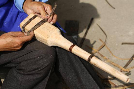 制作蘆笙大的工序有12道,再細(xì)一點(diǎn)有幾十項(xiàng)。如第一道是到山上去選竹子,拿尺子慢慢比劃,三拳的有多長,要很細(xì)心地選,確實(shí)可以用。取下來之后,第二道工序是拿到河邊去洗,用紗布搓。因?yàn)橹窆苡泻芏喟唿c(diǎn),關(guān)節(jié)處有很多毛,要很細(xì)致的把那些東西全搓掉。弄好之后用太陽曬,曬干曬白。第三道工序,就是取杉樹的木頭做笙斗,計(jì)劃好做三拳的是多少公分,四拳是多少公分。十二道工序,后面越學(xué)越復(fù)雜,每一道工序都很講究。