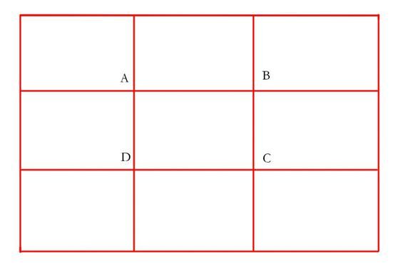 井字形構(gòu)圖和黃金分割法構(gòu)圖是什么意思呢?就是在拍攝的時(shí)候,拍攝主體也就是興趣點(diǎn),根據(jù)現(xiàn)場(chǎng)的情況,放在這ABCD這四個(gè)位置上,這樣看起來畫面是比較舒服,是比較協(xié)調(diào)的,比如說你拍攝一個(gè)人,人頭應(yīng)該是在交叉點(diǎn)上。