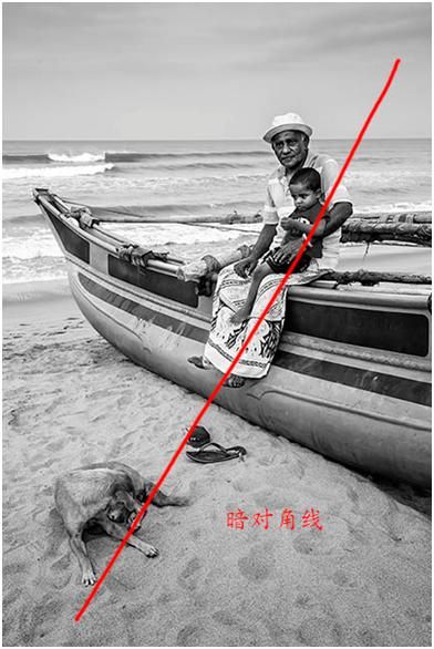這個(gè)海邊老人跟狗之間也形成了暗對(duì)角線,包括下面的這個(gè)在拍照的人跟這個(gè)雕塑之間也形成了一個(gè)暗對(duì)角線,所以這個(gè)畫面非常平衡,不是一邊重一邊輕,而且不呆板。所以對(duì)角線這種形式非常實(shí)用。