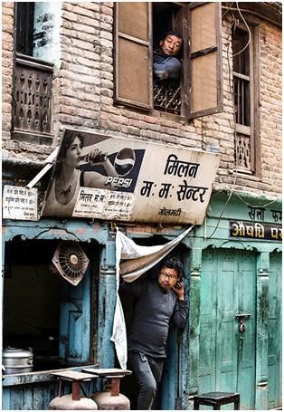 上面這兩張圖第一張,歸類為半包圍。第二張圖也是半包圍,在尼泊爾的一個(gè)小鎮(zhèn)拍的,旁邊兩個(gè)人是背影,實(shí)際上把這個(gè)人夾在中間,所以這個(gè)人特別容易引起你的注意,形成了一種包圍趨勢(shì),在電影的鏡頭語言中運(yùn)用的比較多。