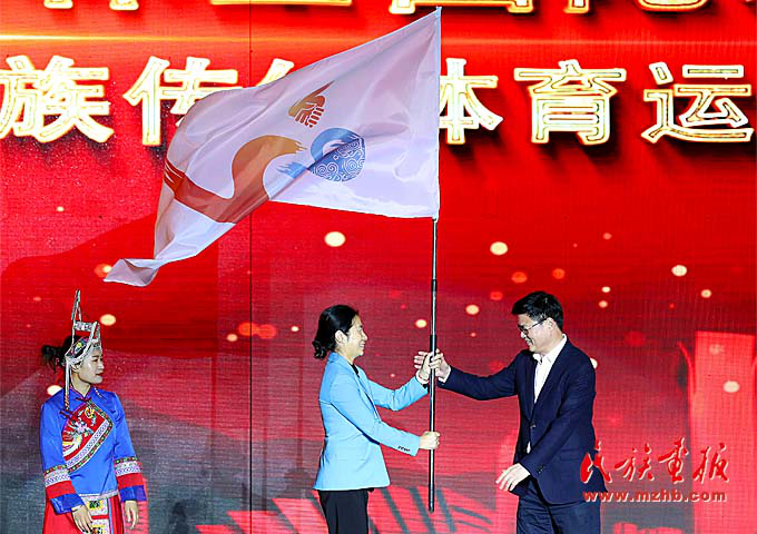 國家民委監(jiān)督檢查司司長隋青向運動會授旗。