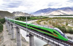 蒼翠的雅魯藏布江河谷中,全新的復(fù)興號(hào)列車呼嘯而過(guò),與奔騰的江水一起向著“西藏江南”林芝駛?cè)ァ?/p>