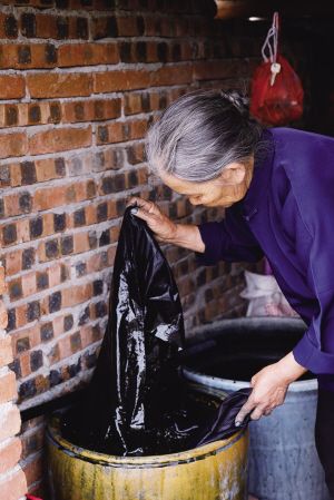 “染好后,顏色會掉嗎?”由于過往體驗,我對藍(lán)染的穩(wěn)定性存有懷疑。“好的黑布,要反復(fù)染一個多月,做出來的衣服再洗就不容易掉色??赡荛_始掉一點點,洗兩三次后就不掉了?!秉S奶奶篤定地回答。