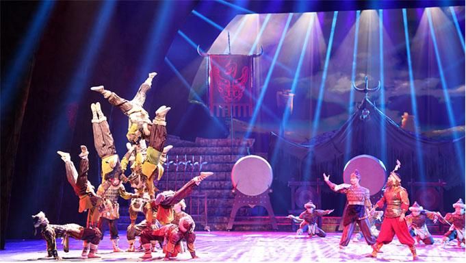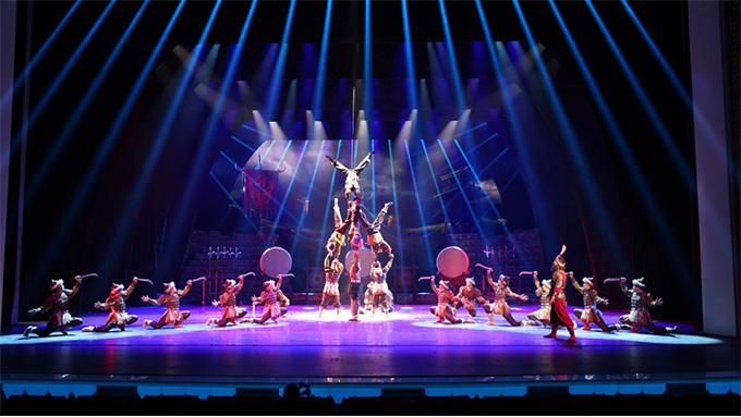 雜技是這部劇的一大亮點。新疆生產(chǎn)建設(shè)兵團雜技團近年來編創(chuàng)了《天鵝湖—男子倒立技巧》《向太陽—繩技》《春之韻—女子造型》等多個精品節(jié)目,并在國內(nèi)外重大雜技賽場多次獲獎。《樓蘭尋夢》中,主創(chuàng)團隊將這些獲獎節(jié)目進行拆解,將蹬鼓、獨輪車、吊環(huán)、肩上芭蕾、水流星及舞中幡等雜技技巧與戲劇元素相融合,讓觀眾猶如置身于黃沙漫漫的絲路古國。