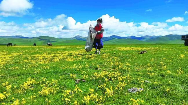 自那以后,才培和更求拉毛大手牽小手,從這個牧帳撿到那個牧帳,從日出撿到日落……更求拉毛已記不清到底撿了多少塑料袋、廢鐵皮、飲料瓶。但在她看來,嘉塘的遠山和近水,終有一天會如藍天白云般凈澈,這也成了她和父親的共同夢想。