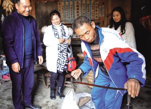 在村里修復(fù)舊屋的趙貢彩接到游客電話,馬不停蹄地趕回家中,自家手工制作的苕粉成了游客心心念念的香餑餑。拿出早已生銹的秤桿,一袋袋苕粉被游客搶著購買?!岸际橇糁约页缘模南胫苜u出去喲。”笑著說罷,趙貢彩拿出手機(jī),微信一掃,錢款立即到賬。