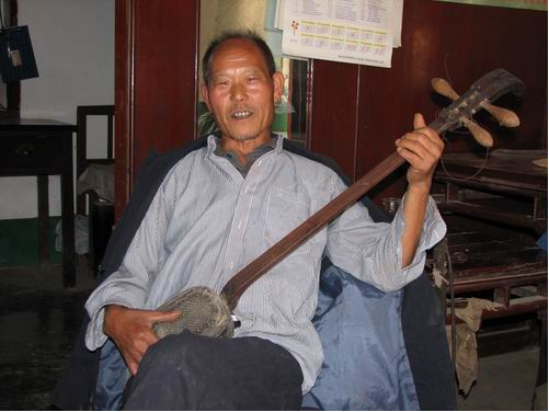五峰南曲無專業(yè)藝人,“門第師”家傳者居多。師徒間手藝南曲兼學(xué),親朋相教亦不少。其演唱形式以坐唱為主,一人自彈自唱,或二人一彈一唱,亦可多人一起彈唱。自制小三弦是其主要伴奏樂器,也有配以二胡、簡(jiǎn)板的,并不拘于一格。