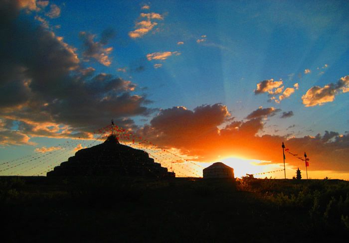 旅游中心所祭祀的“格根查干敖包”,原本屬于本土牧民祭祀的古老部落扎薩克敖包,曾經(jīng)由博教(薩滿(mǎn)教)大師開(kāi)光,后來(lái)的佛教高僧對(duì)這座敖包又融入了符咒,實(shí)屬擁有“靈性”的正宗敖包。旅游中心為了充分展示遠(yuǎn)古敖包文化的魅力,按照蒙元時(shí)期形成的敖包規(guī)則予以拓展,即以故有的敖包為核心,由12座統(tǒng)一的小敖包,分布于規(guī)則的圓周線上,簇?fù)碇黧w敖包。蒙古族歷來(lái)崇尚數(shù)字的“13”,認(rèn)為這個(gè)數(shù)字既是成功的起點(diǎn),又是萬(wàn)事大吉的象征。這種由“13”組合而成的敖包寓意深刻,“10”是一個(gè)整數(shù),有整合之意,“3”是一個(gè)全數(shù),即代表著天、地、人的統(tǒng)一體,象征著完美無(wú)缺的蒼天之力。源于遠(yuǎn)古時(shí)期的博教,根據(jù)其長(zhǎng)生天學(xué)說(shuō)“上蒼有99重天,下有人間輪相屬年和諧共存”之理念,主體敖包的石壁上制有祭典長(zhǎng)生天的99盞燈座,體現(xiàn)著其三元結(jié)構(gòu)的完美與蒙元時(shí)期正宗敖包的風(fēng)采和神威。
