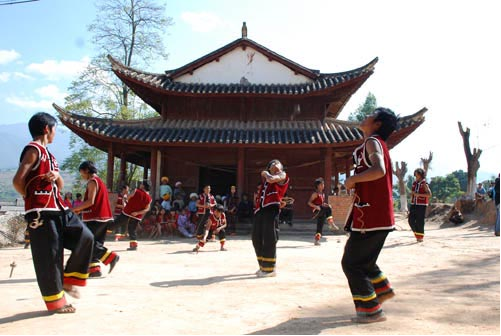 佤族同胞在雙江這片紅土地上長期繁衍生息,積淀了自己獨特的生活和文化習俗。其中最彰顯佤族驃勇個性的就是體育競技“雞棕陀螺”。雞棕陀螺迄今只為雙江佤族所獨有,在全國獨一無二。表演雞棕陀螺極富難度技巧。雞棕陀螺用質(zhì)地堅硬的紫楊木制作,因其外觀像野生菌雞棕而得名。其表演要領(lǐng)是: