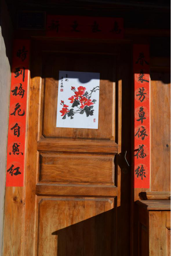 寫春聯(lián)繪年畫的傳統(tǒng)在劍川縣金華鎮(zhèn)由來已久,明朝洪武年間改土歸流和移民屯邊制度的推行,使儒家文化、理學(xué)思想逐漸融入邊疆人民的生活。金華古鎮(zhèn)居民受此影響,走上追求仕途功名的道路,文人鄉(xiāng)紳都以顯示儒學(xué)身份為榮。每逢春節(jié),人們會邀請有功名的仕子或傳學(xué)明經(jīng)的文人來到家中,撰寫對聯(lián),同時根據(jù)時令畫上一兩幅門神畫,希望通過此舉祈愿自家后生求得功名。如今走在金華古鎮(zhèn)西門街上,仍能看到家家種花養(yǎng)草,戶戶楹聯(lián)盈門,一派文風(fēng)蔚然的生機。