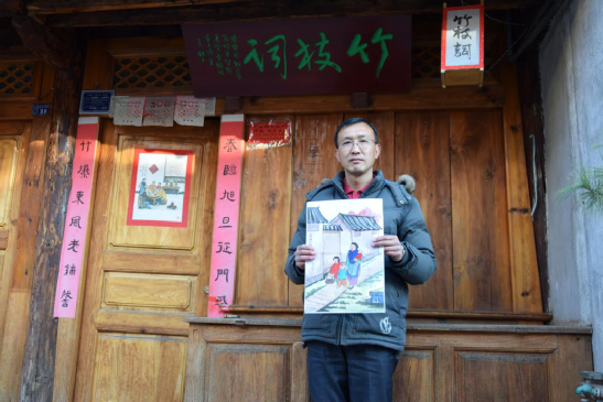 張旭東的童年,是在祖父母的耳提面命中度過的,他跟隨老人習(xí)書繪畫,學(xué)禮明俗。到了弱冠之年,他逐一拜訪古鎮(zhèn)中尚在的民國時期出生的老輩文人,向他們請教劍川白族傳統(tǒng)民俗,并做了系統(tǒng)梳理,這也為他后來繪制年畫、撰寫春聯(lián)打下扎實的理論基礎(chǔ)。