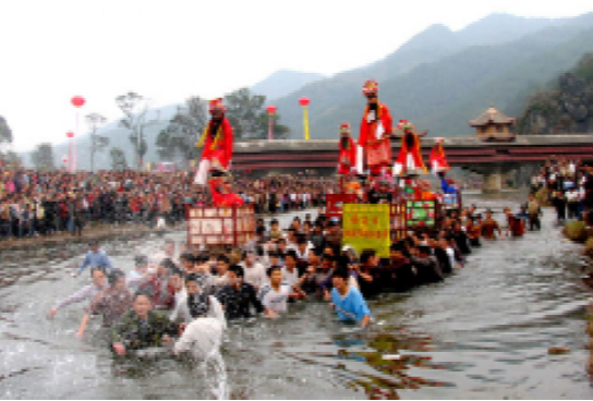 第二次是農(nóng)歷正月十五日上午,分上、下半闕。上半闕仍依十四日走法,至過午一時(shí)許,古事列隊(duì)從“方龍橋”下河床。鼓樂隊(duì)先互相潑水透濕,然后三響神銃,古事棚蜂擁下水,逆水而走。除天宮一棚不能超越外,后棚超前棚,則視為吉利。于是抬夫拼力而為,爭先恐后,不顧天寒水深、河石苔滑,跌倒了再爬起,情緒異常高昂,至下午三時(shí)許,一年一度的走古事才在高潮中落下帷幕。
