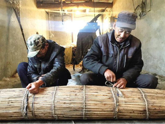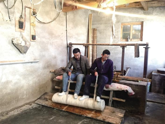 接著,父子幾人配合著,開始蹬簾子步驟?!皳{簾子的步驟最關(guān)鍵?!倍藕C髡f,蹬簾子的時(shí)候,蹬的時(shí)間長了不行,短了也不行,要掌握好時(shí)間,才能達(dá)到最好的效果?!澳亩夹枰?xì)化,稍不精細(xì)就會出現(xiàn)氈散了、爛了,做不成功就廢了?!闭f著,杜占財(cái)和杜占福在杜海明的帶領(lǐng)下,三人用雙腳,來來回回仔細(xì)地進(jìn)行著搟簾子。