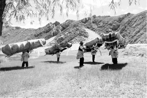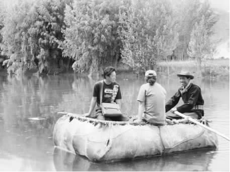 據(jù)當(dāng)?shù)厝私榻B,牛皮船構(gòu)造簡單,用木頭做船架、牛皮做船體。首先采用比較堅(jiān)硬有彈性的樹木來做骨架,然后把牦牛皮泡在水里,將皮上的毛和肉全部去掉后,用四張牛皮并對縫起來,趁牛皮軟時包在骨架上,同時用牛皮繩子捆緊繃好、曬干、擦油定型,再在牛皮接頭處采用牛、羊油來堵住縫口密封好,避免進(jìn)水。
