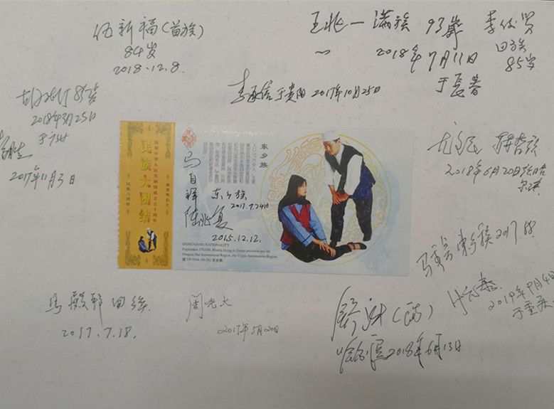 在采集口述影像錄音資料的同時,項目組還收集了大量的珍貴歷史照片以及相關文物。值得一提的是,他們設計了一種非常有特色的受訪者簽名簿,中間貼著繪有56個民族的音樂舞蹈圖案的首日封或明信片,四周簽上受訪者的人名簽名字、民族特征,有些還用民族文字書寫,體現(xiàn)了中華各民族團結在一起的精神風貌。簽名簿有厚厚的幾大本,設計精美,承載著民族工作口述史資源采集的經(jīng)歷,具有豐富的文化內(nèi)涵和博物館收藏價值。