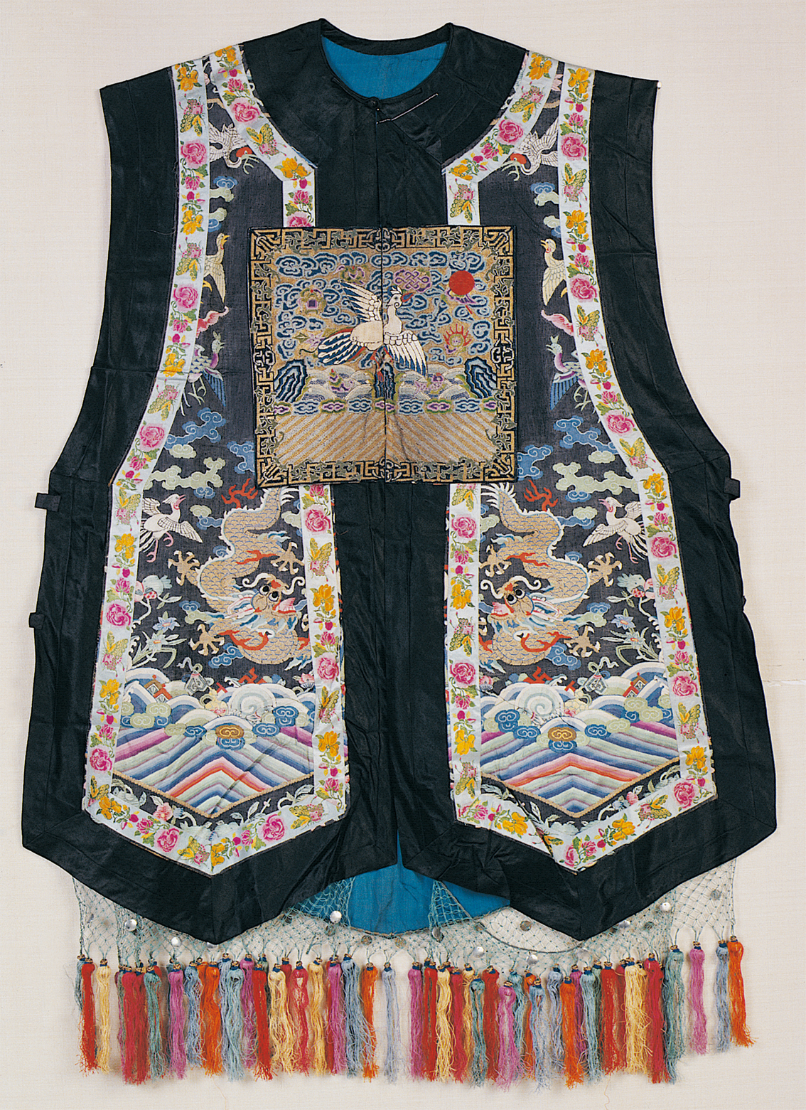 《史記·五帝本紀》載:“黃帝之前,未有衣裳屋宇。及黃帝造屋宇,制衣服,營殯葬,萬民故免存亡之難?!痹谖迩Ф嗄昵暗男率鲿r代仰韶文化時期,可能就產(chǎn)生了原始的農(nóng)業(yè)和紡織業(yè),開始用織成的麻布來做衣服。據(jù)傳,黃帝之妻嫘祖發(fā)明了飼蠶和絲紡,衣冠服飾基本成制。殷商西周,冠服制度逐漸完善,春秋戰(zhàn)國時期,衣冠款式走向多元,冠服制被納入“禮治”范疇,從此漢族衣冠服制更加詳備。中原地區(qū)還出現(xiàn)了胡服戎裝,甚至相沿成風(圖為漢族清代七品文官女朝褂,中央民族大學民族博物館館藏)。