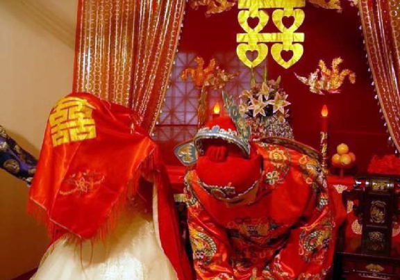 拜堂是婚禮的高潮階段。迎娶之日,男家發(fā)轎之后,儐相就要在男家堂屋布置好拜堂的場所。當(dāng)花轎停在堂屋門前,男方請的伴娘站到花轎前時,儀式即已開始。香案上,香煙繚繞,紅燭高燒,親朋戚友、職司人員各就各位。儐相二人分別以“引贊”和“通贊”的身份出現(xiàn),開始贊禮,新郎新娘拜堂。傳統(tǒng)“三拜”:“一拜天地,二拜雙親,夫妻相拜”,最后才“引進洞房”。