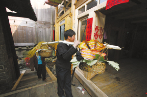 最令人稱奇的是,女方家還用編織的花帶捆住一個(gè)豬頭,由男方指定一人掛在腰間帶回家。此人出門時(shí),還要在嘴里含三束棉花、三根稻穗和一條豬尾巴(出門走一段路后,可隨意放置在身上任何地方)。沒燒過毛的豬頭,鮮血淋淋;燒過毛的,則黑不溜秋。背的人在路上走,既不能洗,也不能換人背,更不能肩挑手提或二人抬著走。如果女方家養(yǎng)的是頭大肥豬,這位老兄就必須是位彪形大漢,要不然,一路上可要吃點(diǎn)苦頭了!