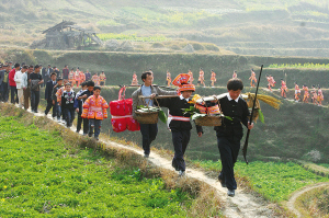 婚禮那天,娶親隊(duì)伍必須很早就上路。領(lǐng)頭的是娶親人(必須是家庭條件好、有威望的成年男子),他要帶上一支鳥槍或一把古戰(zhàn)刀,一方面表明“我是來娶親的”,同時(shí)也是為了避邪保平安。而這刀、槍會(huì)在進(jìn)門后由女方家接下,儀式結(jié)束后再退還。