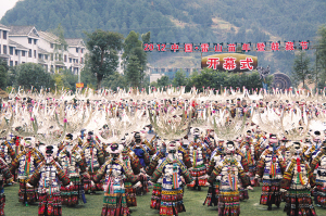 今年適逢雷山縣多個(gè)村寨過13年一次的鼓藏節(jié),2000余名苗族同胞在開幕式上再現(xiàn)了古老神秘的祭鼓儀式。鼓藏節(jié)也是緬懷先人、祭祀祖宗的古老節(jié)日,過節(jié)期間,家家宰豬祭祖,走親訪友,舉行跳蘆笙舞、斗牛等民間傳統(tǒng)活動(dòng)。