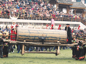 苗族同胞敲起特制的大鼓,慶祝鼓藏節(jié)的到來