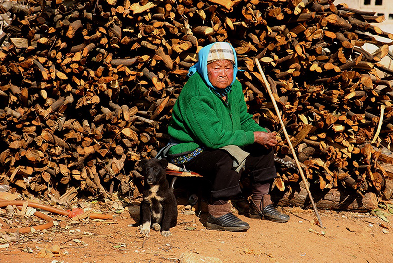 2月初的丘北,連日陰雨,是一年中最冷的時節(jié)。我先于拍攝團(tuán)隊幾天到了村里,想獨自在這里轉(zhuǎn)轉(zhuǎn),熟悉一下村民,篩選一下拍攝的人物。正當(dāng)我在一個泥濘的岔路口徘徊,尋思著是否要問路去村主任家的時候,旁邊屋子里走出一個人,面容親善:“天好冷啊,進(jìn)來烤烤火吧!”他打招呼的方式如同熟人,一笑時露出兩排又白又整齊的牙齒。于是,他家擁擠的火塘邊又多了一個人。大家圍著火爐有一搭沒一搭地聊天,語調(diào)溫和小聲,沒話的時候大家也不覺得別扭,只聽見玉米骨在火塘里噼啪作響。這是一個五代同堂的大家庭,招呼我的主人楊樹紅和妻子以及祖母、父母一起生活,兒子和女兒在廣東打工,已經(jīng)回村準(zhǔn)備過節(jié),兒子未婚,女兒則有了兩歲的孩子。楊樹紅的祖母出生于1922年,是這個村子里最老的老人,耳朵有些背。我大聲問她是否還記得年輕時候踩花山,她拍著我的手背說:“17歲我就去踩花山嘎!好玩嘎!”兒媳笑著解釋說:“估計她說的是17歲踩花山的時候碰到爺爺,被他拖媳婦拖走的事呢?!弊婺改昙o(jì)太大,看著她手上和臉上深深的褶皺,不知藏了多少往事。