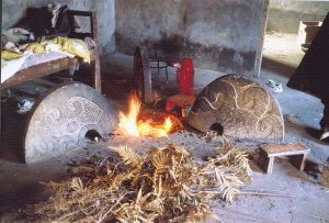 涼山彝族獨特的“鍋莊石” 。彝族的火塘為全家的生活中心,進食、取暖、照明、會客、議事等都圍著火塘進行?!板伹f”由3塊石頭支撐,一般在房屋建成前就請石匠打造好鍋莊石。其石料選取沒有污垢而又無缺陷的青石,鑿成厚10厘米左右的變異扇形,上面刻有龍、火、日、月、魚、鳳等古樸傳神的浮雕圖案。日常生活中,一般在鍋莊“上方”(火塘里側(cè)至墻壁)設矮床。