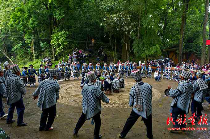 在“寨老”敲響的銅鼓聲里,男人們揮舞著有力的手臂,舞動著彪悍的動作;姑娘們踏著歡快的鼓點,擺手扭腰跳起優(yōu)美的舞蹈;孩子們像林中的小鳥,嘰嘰喳喳地在人群中歡呼雀妖;寨里的老人們坐在場地中央,盡情地享受著包谷美酒和美食。