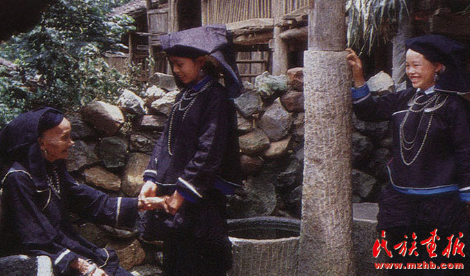 婦女的服飾更具特點,無論老少,都喜歡穿右蓋大襟和葫蘆狀矮腳圓領的緊身短式上衣,下身以寬褲腳、大褲頭的褲子相搭配,腰系黑布做成的大圍裙,頭帶黑布大頭巾。其圍裙既寬且長,戴時能系周身有余,裙底垂掛到小腿下部,圍裙不僅作為裝飾,而且可以作為勞動工具,遇趕圩或走親訪友和勞動時,可將圍裙底翻卷上來作成小包袱,用以包裝和盛裝物品。婦女頭巾都是一塊自己紡織染成的長條黑布,戴時先圍繞在頭上,然后翻折擺布成火棱形的圖樣,罩在整個頭上,再把頭巾的兩端分別垂掛到雙肩上,看上去樸素美觀。同時還可以當做帽子遮蔭用。她們的衣邊、衣角、袖口、裙邊和頭巾的四邊都用紅布或黃布剪成小條以后鑲捆上去,有的則用紅、黃、藍色絲線繡成波浪形的線條,使黑中襯出紅、黃、藍色的線條來,清雅明亮,色彩協(xié)調。再加上頭發(fā)插著龍頭形的銀簪,頸項上帶有銀鏈或項圈,手帶銀圈、玉鐲,耳掛珍珠耳環(huán)等,使人一看,黑中閃艷,樸素之中亦有玲瓏之美,表現(xiàn)了她們獨特的審美觀。
