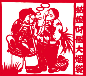 滿族風(fēng)情剪紙《姑娘叼個大煙袋》