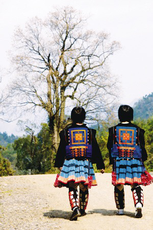 白褲瑤女人身上最惹眼的,除了百褶裙,還有她們衣服背后那一個(gè)個(gè)大大的方形圖案。傳說(shuō)900年前,白褲瑤首領(lǐng)有一方皇帝賜給的權(quán)印,被女婿以哄孫子為借口,借走并用假印調(diào)了包,瑤族人因此被趕進(jìn)山里,過(guò)起了少田缺水的游耕生活。為了告誡子孫不要忘記因?yàn)閱适?quán)力而導(dǎo)致苦難的教訓(xùn),從此,白褲瑤就在女人的馬鞍衣后面,繡上了一個(gè)形狀像首領(lǐng)印一樣的彩色方塊圖案。這是一種紀(jì)念,也是一種懷念。裙擺拂過(guò)落葉,一如群蝶穿越花叢。