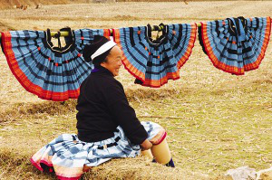 白褲瑤女人體態(tài)婀娜。這婀娜既來(lái)自于她們風(fēng)擺楊柳般的百褶裙,也來(lái)自身上前后兩片的夏衣。夏衣,黑色的調(diào)子,沒(méi)領(lǐng),沒(méi)袖,前面是一塊和肩膀?qū)挾认嗟鹊恼叫嗡夭?,后面則是用蠶絲布來(lái)制作的裙邊土布,上面繪滿了蠟染和花繡圖案。用漿染土布縫制成的百褶裙上,布滿了手繪而成的彩色圖案。其最復(fù)雜的工序,一是借粘膏樹汁憑空勾畫,二是用花線依著粘膏樹汁描過(guò)的隱約印痕,一點(diǎn)一點(diǎn)地挑繡出彩色圖紋來(lái)。做好一條裙子,往往需要花上女人們半年的時(shí)間。