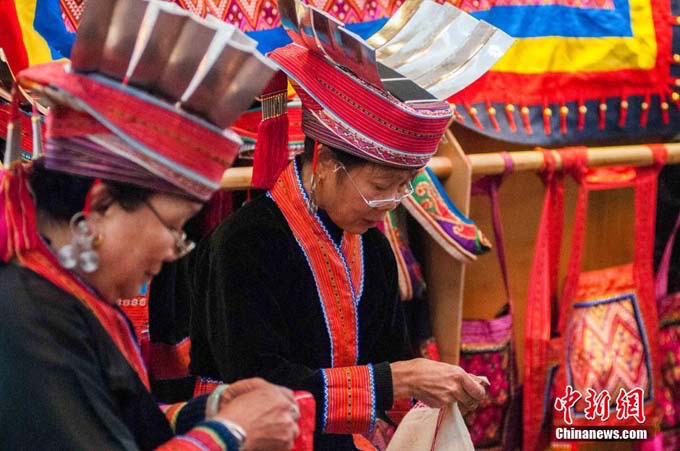 12月6日,在中國(guó)瑤族之鄉(xiāng)廣西金秀瑤族自治縣的盤王節(jié)上,當(dāng)?shù)乩弦惠叕幾鍕D女展示瑤族織繡