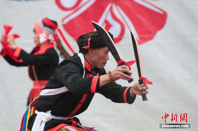 12月6日,在中國(guó)瑤族之鄉(xiāng)廣西金秀瑤族自治縣的盤王節(jié)上,當(dāng)?shù)噩幾灏傩赵谔钡段琛?/span>