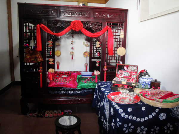 白族婚禮一般要舉行四天,第一天叫“預(yù)喜”,主要是殺豬宰羊,搭彩棚,迎喜神,接月老以及布置客堂、洞房和貼對聯(lián)等。第二天為“正喜”,嗩吶高奏,鑼鼓喧天,或騎馬或坐轎,迎親隊(duì)伍浩浩蕩蕩到女方家迎新娘,在完成了一系列妙趣橫生的禮儀后,經(jīng)媒人再三催請后,新娘才依依不舍,由其親兄長背出門。新娘迎出門外后,新姑爺還要專門返回給丈母娘磕頭拜別,意為“回馬謝親”。新娘進(jìn)門時(shí)要跨火盆或馬鞍,表示興旺或平安,有人還要故意在火盆里灑上辣椒面,嗆得大家流淚,白語里“辣”叫“qil”,與“親”諧音,表示以后親親密密。新娘迎進(jìn)門后,拜堂前要梳妝,即女子換頭禮,請年高婦女為新婦梳頭,先戴鳳冠,然后換成紗帕,腳踩裝滿糧食的斗,寓意五谷豐登,魁星踢斗。斗中擺一桿秤,寓意新娘心像秤一樣公平,對丈夫?qū)Ω改敢灰曂?,又放置一把剪刀,表示新娘對愛情的忠貞不二。第三天回門。新娘清晨早起,在別人幫助下“收頭”,將頭發(fā)梳成高高的髻,作為成人的標(biāo)志,然后由新郎陪同回娘家。新娘手中提著一籃糖果,有花生、瓜子、水果糖之類,路上遇到熟人和小孩,就抓給一把。這天新娘家要辦酒席招待女婿,女婿一一拜見岳家長輩,新婚夫婦當(dāng)日返回男家。第四天酬客,折彩棚,招待幫忙的客人。