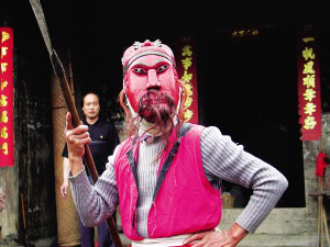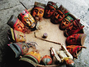 陽戲是一種原生態(tài)戲劇,其中道具的使用必不可少。主要包括服裝、面具、法器、樂器。面具在陽戲表演中占有突出的地位,是神靈的憑依和具象化。其面具有關(guān)圣帝、皇生、小生、老生、老丞相、元帥、老臣等共16面。在陽戲表演中,旦角(貴妃)是沒有面具的,搭帕子在頭上,身穿旦角服裝。面具為白楊木質(zhì)材料,精雕細琢,上面覆以濃重的彩繪。面具造型別致古樸,以頭冠和面相的特征區(qū)分角色,在藝術(shù)風格上頗具地方特色。