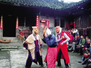 土家族陽戲在貴州、湖南、重慶等省、市都有流傳,湖南省張家界陽戲和重慶酉陽陽戲均被列入了省級非物質(zhì)文化遺產(chǎn)名錄,得到保護和重視。貴州沿河土家族自治縣的土家族陽戲同樣古樸而充滿風韻,5月19日,當?shù)氐囊慌幕ぷ髡邤M通過挖掘整理,把獨具地方特色的面具陽戲申報為省級非物質(zhì)文化遺產(chǎn),希望沿河陽戲同樣受到重視和保護。