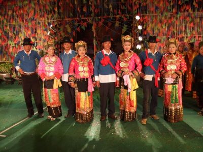 主婚人念完祝詞以后,新郎、新娘各在桌上揪下一團(tuán)糯米飯,蘸點(diǎn)米酒、食鹽、舂鹽捧、芭蕉后擺在桌前。主婚人拿起一條長(zhǎng)長(zhǎng)的白線,從左至右纏在新娘、新郎的肩背,將白線兩端搭在“茂歡”之上,表示將一對(duì)新人的心拴在一起。然后再拿兩縷白線,分別纏在新郎、新娘的手腕上,祝愿新婚夫婦百年好合,無災(zāi)無難。在座的長(zhǎng)者也各拿兩縷白線,分別拴在新郎、新娘手上,邊拴線,邊念些祝愿詞。拴完線后,婚儀基本結(jié)束,婚宴開始,新郎新娘向賓客敬酒致意。