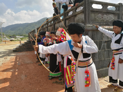 比賽形式有粑粑打、射雞蛋、射刀刃等。粑粑打,每當過年時,怒江傈僳族都要舉行射弩比賽,射手每人出幾塊包谷粑粑作靶子放在 50 步開外用弩弓射擊,射中贏得粑粑,每人射 5 箭,年成好時用成塊的肉作靶子.體積比粑粑小得多,射中者意味著新的一年財運好,打獵收獲大。射弩男人為主,女人也時有參加。最后大家把獎品拿出來,加之以酒,暢飲大吃,以歌助酒,盡歡而散。射雞蛋。流行于怒江峽谷各地,多在“盍什”節(jié)或正月間的澡堂歌會時舉行。作為靶子的雞蛋不是放在地上,而是置于姑娘們的頭上,她們每個人頭上頂一個碗,碗中放上米,雞蛋放在米上,射手距姑娘的距離 10 米、 30 米、 50 米不等,要看雙方的膽最和技術(shù),箭風過處,雞蛋在頭頂破碎。流行于怒江和麗江傈僳族中的射刀,時間在春節(jié),距射者 20 米處立長刀一把,刀刃朝射弩者。如中刀口,弩箭自然剖成兩半,如射不中;箭就輸給勝者。另有村寨對抗,用粑粑和豬頭為箭靶。參加者數(shù)十或上百,均分兩隊,以相同的箭數(shù)中靶多少定勝負,勝者贏得粑粑和豬頭,大家同享。