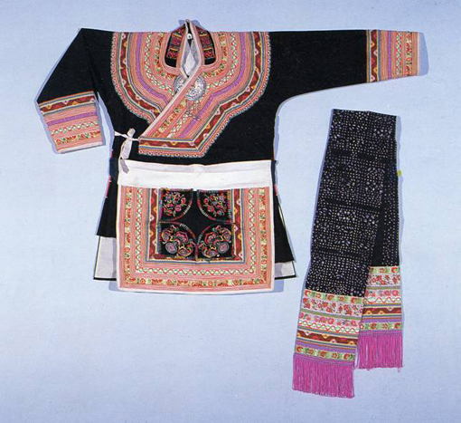 羅連式的鳳凰裝的特點(diǎn)主要在褲裝上,居住在福建羅源、連江、寧德南部一帶的畬族婦女喜好穿黑色短褲,打上綁腿,衣領(lǐng)1.5寸高,繡柳條圖案,柳條以紅、黃、綠、紅、藍(lán)、紅、黑、紅、水綠的顏色順序排列而成,也系圍身裙,裙上圖案多為大朵的云紋,而裙邊則飾以柳條紋。